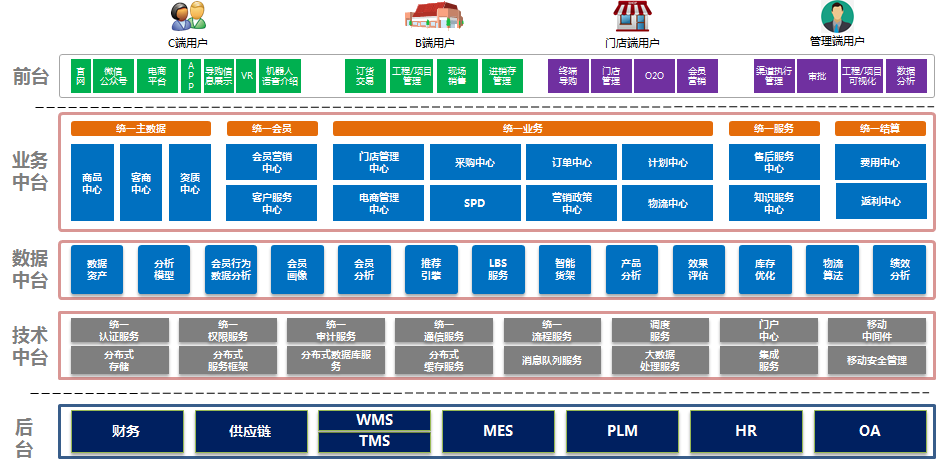 按照前、中、后台的应用架构理念,基于用友YonBIP 营销云打造数字营销中台,建立商品中心、资质中心、会员营销中心、客户服务中心、门店管理中心、订单中心、营销政策中心、费用中心、返利中心等业务中台应用,实现统一主数据、统一会员、统一业务、统一服务、统一结算;经营管理后台采用用友NC6医药行业解决方案,打通财务、供应链、HR等业务,实现业财一体化运营。